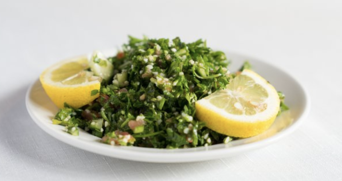 Parsley, tomato, cracked wheat,  mint, lemon juice, and olive oil.